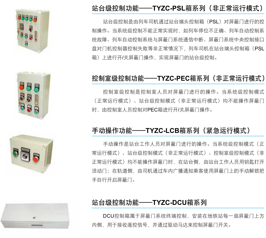 随着城市现代化建设的不断发展,轨道交通得到了高速发展,而轨道交通屏蔽门系统以其安全、节能的特点,得到了愈来愈广泛的应用。上海天逸电器有限公司针对轨道交通屏蔽门系统研发了一系列专用控制箱——包括PSL箱、PEC箱、LCB箱、DCU箱,PSC箱及电源柜。